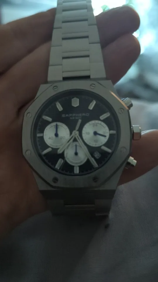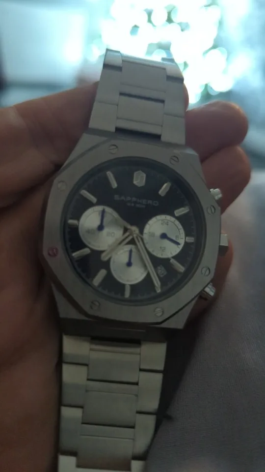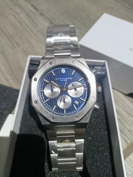 Fonctions : Chronomètre, date automatique, calendrier complet, aiguilles lumineuses, anti-magnétique, résistant aux chocs
